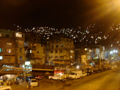 A picture of Rocinha at night from the bridge that crosses over the freeway to where the illegal buses back to Leblón wait.